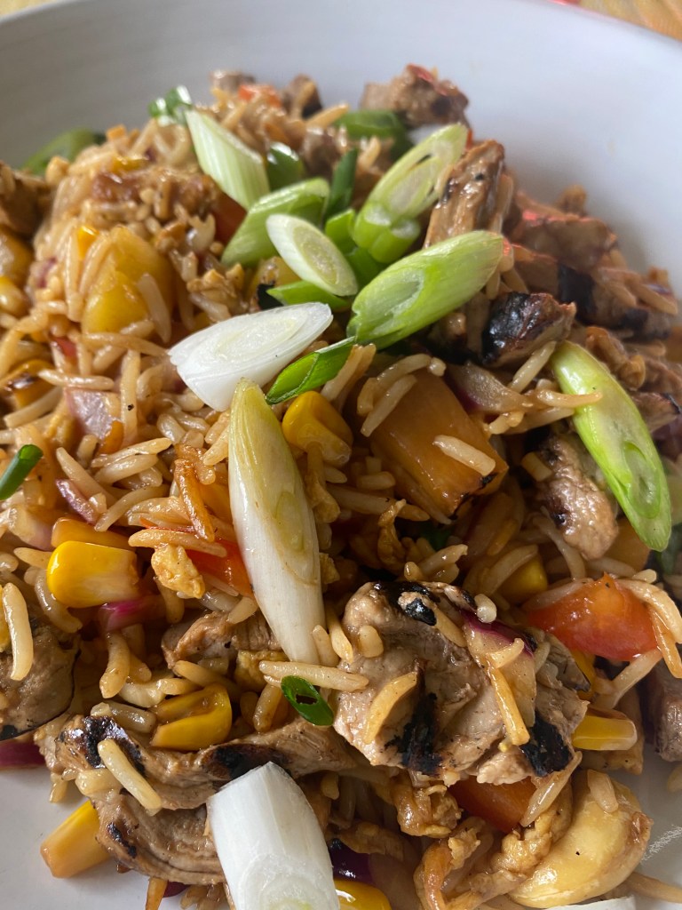 Fried Rice is a quick easy, and dare I say, the ultimate ‘Fakeaway’ It is a real lets throw it together sort of dish, all you need is a packet of microwaveable rice, an egg, and some leftover meats and any selection of vegetables. Nothing will not work really. Theres no real recipe.