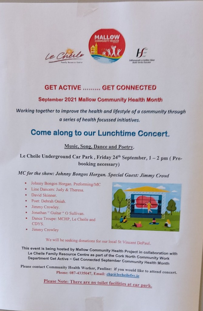 its happening at the Le Cheile Underground Carpark this Friday the 24th of September 2021 from 1-2pm pre-booking is necessary, with the Community Health Worker Pauline on 0874335047