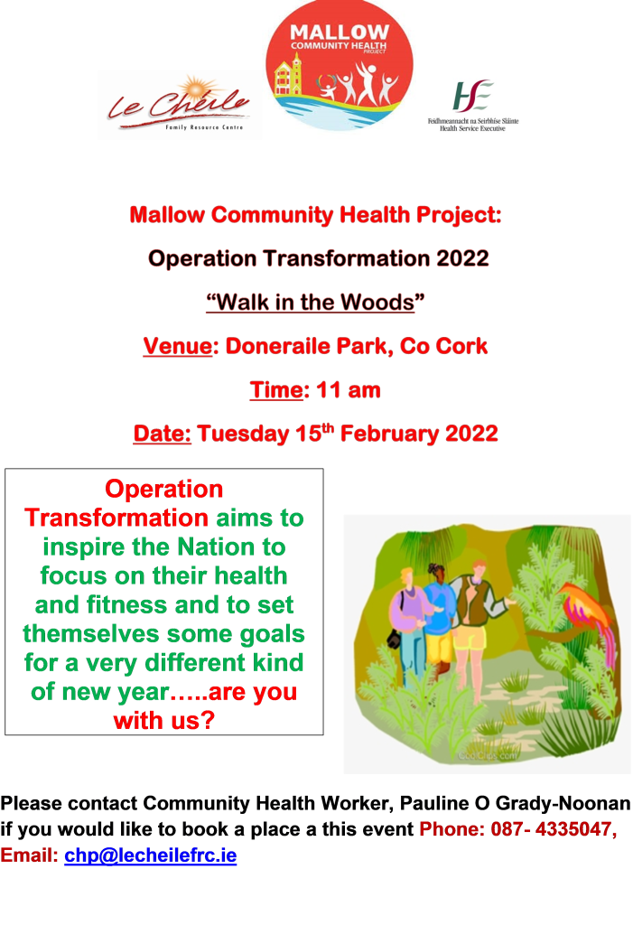 Mallow Community Health Project are organising an Operation Transformation Walk on Tuesday the 15th February ” Walk in the Woods” , in Doneraile Park, Co Cork at 11 am. For further information and to register for this walk , pleas contact Community Health Worker, Pauline O Grady-Noonan : 087 4335047 or Email chp@lecheilefrc.ie